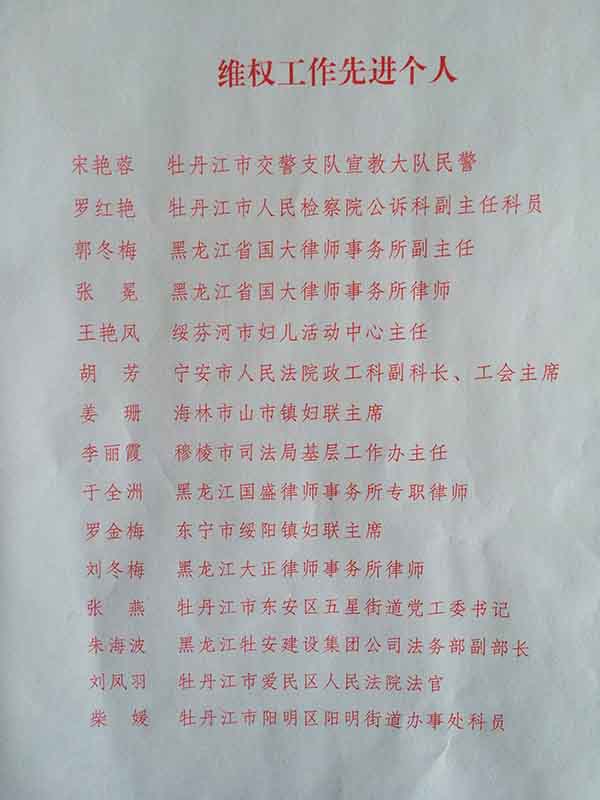 集團(tuán)公司法務(wù)總副部長、機(jī)關(guān)支部書記朱海波,始終堅持把滿腔的熱情化作工作的動力,在公司工會的正確領(lǐng)導(dǎo)下,以維護(hù)女職工合法權(quán)益為主題,提高全體女職工素質(zhì)為目標(biāo),充分調(diào)動了廣大女職工的積極性、創(chuàng)造性,為構(gòu)建企業(yè)和諧發(fā)展做出了積極的貢獻(xiàn)。維護(hù)好女職工的合法權(quán)益和特殊利益,是婦委會基本職責(zé)和不可推卸的責(zé)任,積極開展權(quán)益保障行動,把維護(hù)女職工的合法權(quán)益作為一切工作的出發(fā)點(diǎn)和落腳點(diǎn)。關(guān)心困難女職工生產(chǎn)和生活情況,定期開展“愛心送溫暖”幫扶活動,并組織廣大女職工積極參與牡丹江市組織的“我為雪城添新綠”“關(guān)愛母親河”“金秋助學(xué)”“共享陽光關(guān)愛留守兒童”等系列公益活動,充分調(diào)動廣大女職工向社會伸出互助友愛之手,共同構(gòu)建牡安集團(tuán)正能量愛心聯(lián)盟。她榮獲牡丹江市婦女聯(lián)合會“維權(quán)先進(jìn)個人”光榮稱號。